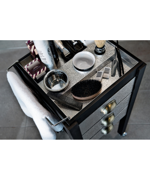 Тележка парикмахерская "BARBER" - для профессионалов Barbershop. Выполнена из дерева, фасады выдвижных ящиков и верхний лоток для инструментов покрыты алюминиевой шпаклевкой. Тележка с артикулом A-м60003086 оснащена вращающимися прорезиненными колесами, тремя выдвижными ящиками, стальным держателем для полотенец, выдвижным боковым карманом для полотенец, а также функциональной столешницей с отделениями под сопутствующие аксессуары.