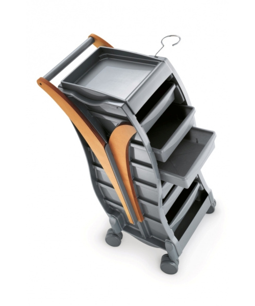 Тележка парикмахерская "OLA" - на прорезиненных колесах для комфортного и бесшумного перемещения. Имеет удобные боковые деревянные ручки, 5 выдвижных ящиков и металлический фенодержатель. Отличительной особенностью является наличие деревянной вставки на боковых стенках тележки с артикулом A-м60003085.