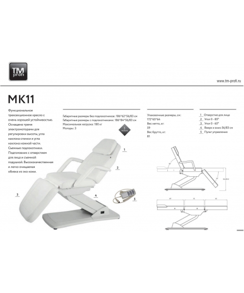 Кушетка косметологическая, кресло "MK11 STER"  3 электромотора – гибкая в настройке положения модель, в которой для удобства регулировки установлен производительный электромотор. Секции кресла можно регулировать независимо друг от друга. Клиент может сидеть как в сидячем положении под 90 градусов, так и лежать на идеально ровной поверхности – кресло можно разложить на 180 градусов. Подголовник у кресла съемный.