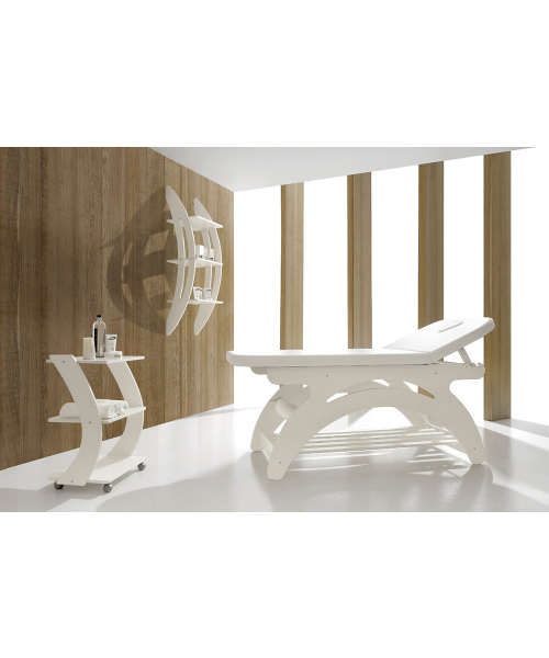 Это сочетание необычного дизайна и функциональности. Модель изготовлена из натуральной древесины березы и доступна в двух вариантах – с полками из дерева и с полками из стекла. Деревянные полки могут быть выполнены в нескольких цветовых решениях – грецкий орех, венге, выбеленный клен. Стекло используется прозрачное. Полки выполнены в форме квадратного поддона и подходят как для хранения различных СПА-средств, так и полотенец. Производителем предусмотрены колесики, за счет которых тележку можно легко перемещать. Модель отличается надежностью, износоустойчивостью и долговечностью.